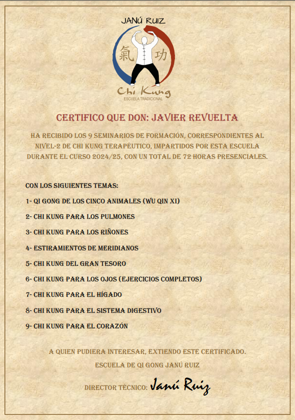 Es graduado en Chi-Kung (Qi Gong) por la Escuela Janu Ruiz.